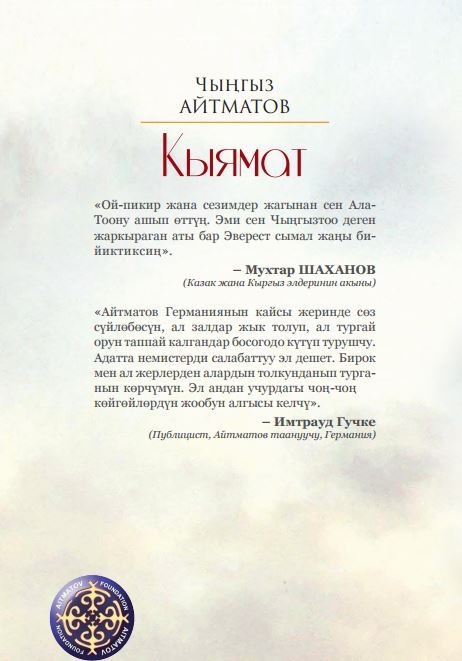 «Кыямат» романы - 80-жылдардын ортосундагы көрүнүктүү прозалык чыгарма. Жазуучунун башка чыгармаларындай эле “Кыямат" романы турмуштун курч карама-каршылыктарынын трагедиясына жык толгон.