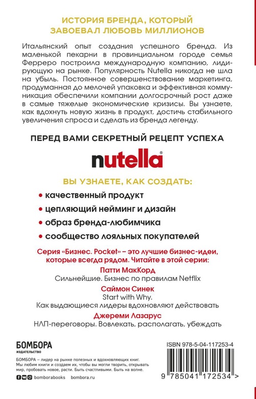 Итальянский опыт создания успешного бренда. Из маленькой пекарни в провинциальном городе семья Ферреро построила международную компанию, лидирующую на рынке. Популярность Nutella никогда не шла на убыль. Постоянное совершенствование маркетинга, продуманная до мелочей упаковка и эффективная коммуникация обеспечили компании долгосрочный рост даже в самые тяжелые экономические кризисы. Вы узнаете, как вдохнуть новую жизнь в продукт, достичь стабильного увеличения спроса и сделать из бренда легенду.